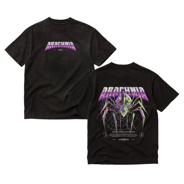 Camiseta básica unisex 100% algodón, gramaje 165 g/m². Corte regular fit con cuello redondo reforzado y estampado de alta definición. Ideal para un look streetwear cómodo y versátil. Diseño 'Arachnia' con araña futurista en morado y verde, vibes cyber-street.