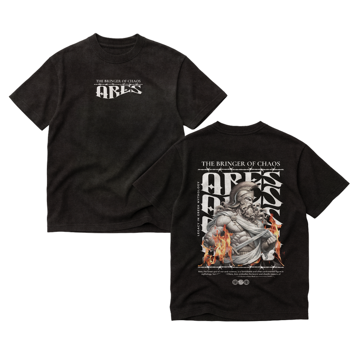 Camiseta básica unisex 100% algodón, gramaje 165 g/m². Corte regular fit con cuello redondo reforzado y estampado de alta definición. Ideal para un look streetwear cómodo y versátil. Diseño 'Ares' inspirado en el dios de la guerra, ilustración con fuego y armadura.