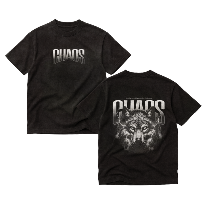 Camiseta básica unisex 100% algodón, gramaje 165 g/m². Corte regular fit con cuello redondo reforzado y estampado de alta definición. Ideal para un look streetwear cómodo y versátil. Diseño 'Chaos' con lobo ilustrado en alto contraste, estética oscura y poderosa.