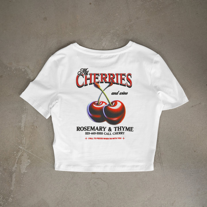 Camiseta 'Cherry Mood' blanca con estampado de cerezas rosadas.
