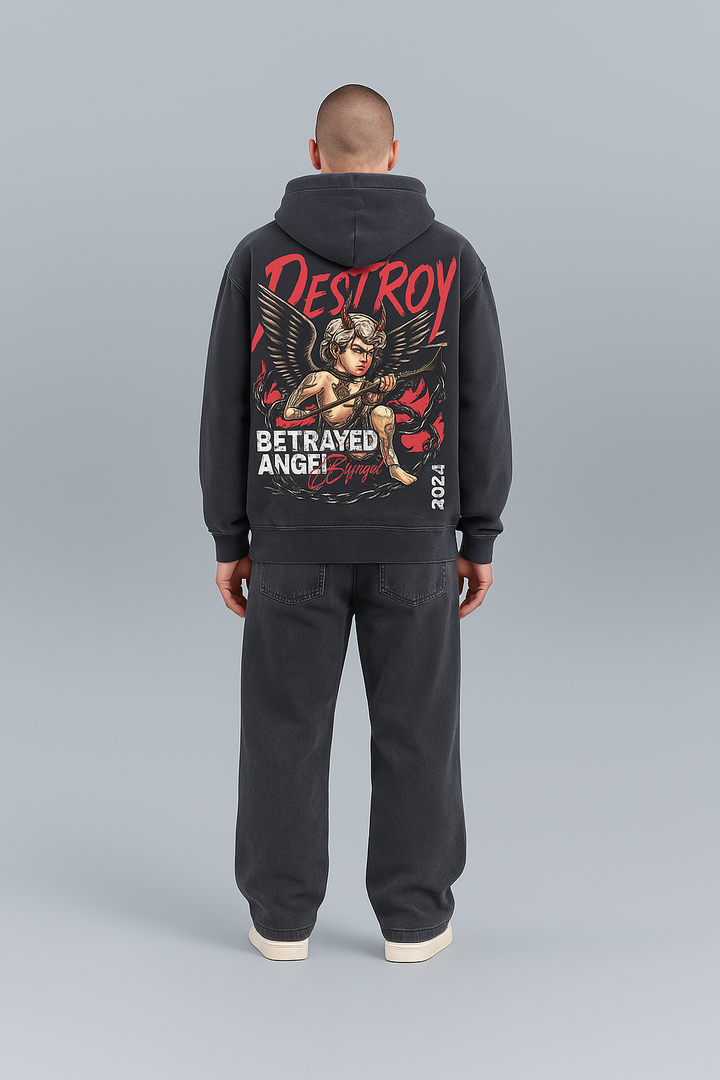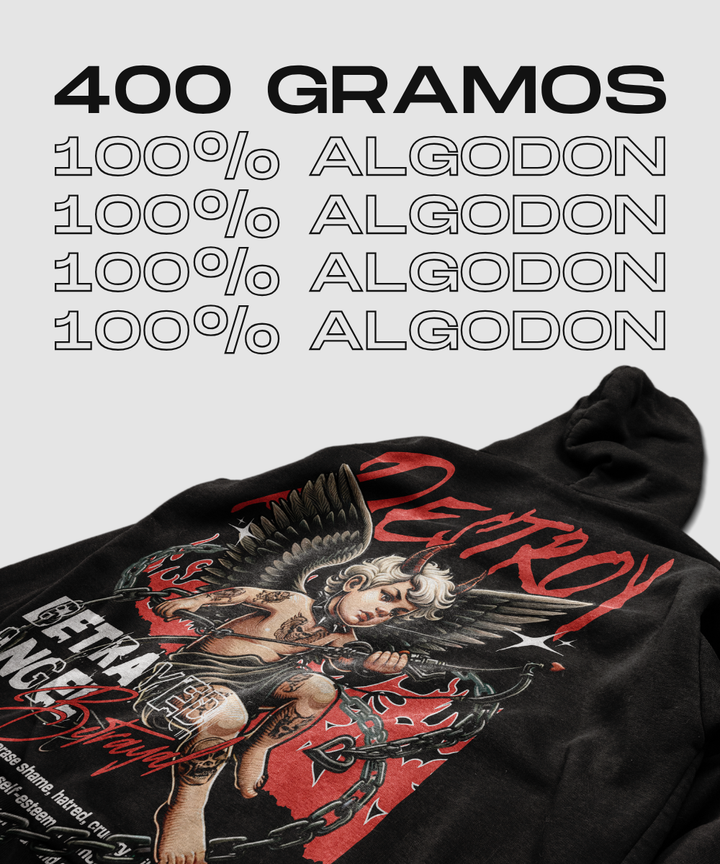 El hoodie 'Destroy Angel' representa fuerza y rebelión con un diseño vibrante en tonos rojos y negros. Parte de la colección ANGELS OF DESTINY, fabricado en algodón suave y cómodo.