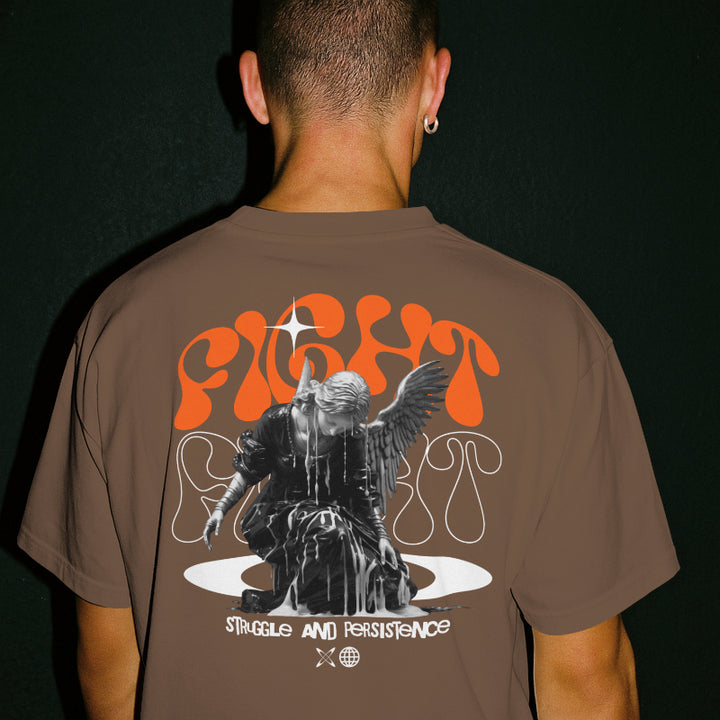 Camiseta marrón 'Fight', diseño con guerrero y energía urbana.