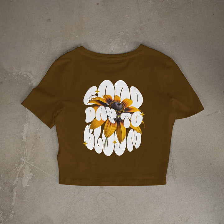 Camiseta 'Good Days to bloom' color mostaza con texto retro.