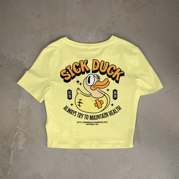 Camiseta 'Happy Duck' amarilla con pato sonriente estilo vintage.