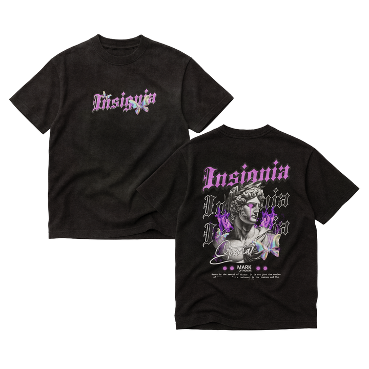 Camiseta básica unisex 100% algodón, gramaje 165 g/m². Corte regular fit con cuello redondo reforzado y estampado de alta definición. Ideal para un look streetwear cómodo y versátil. Diseño 'Insignia' con busto clásico y efectos de neón morado.