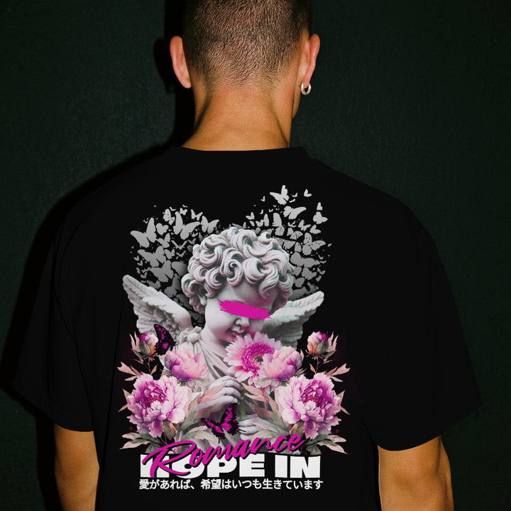 Camiseta negra 'Raven' con flores rosadas y ángel central.