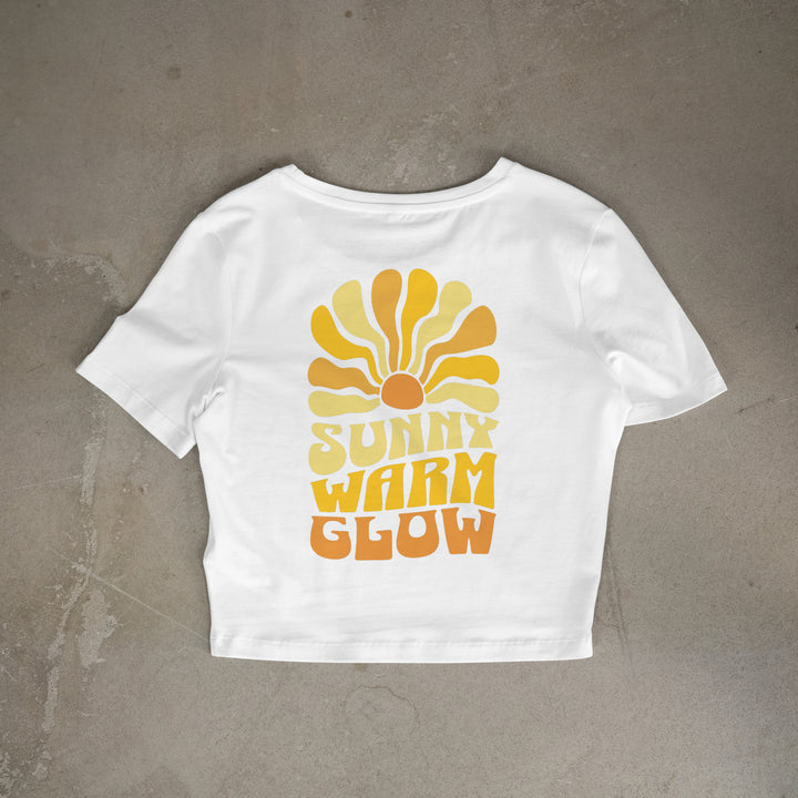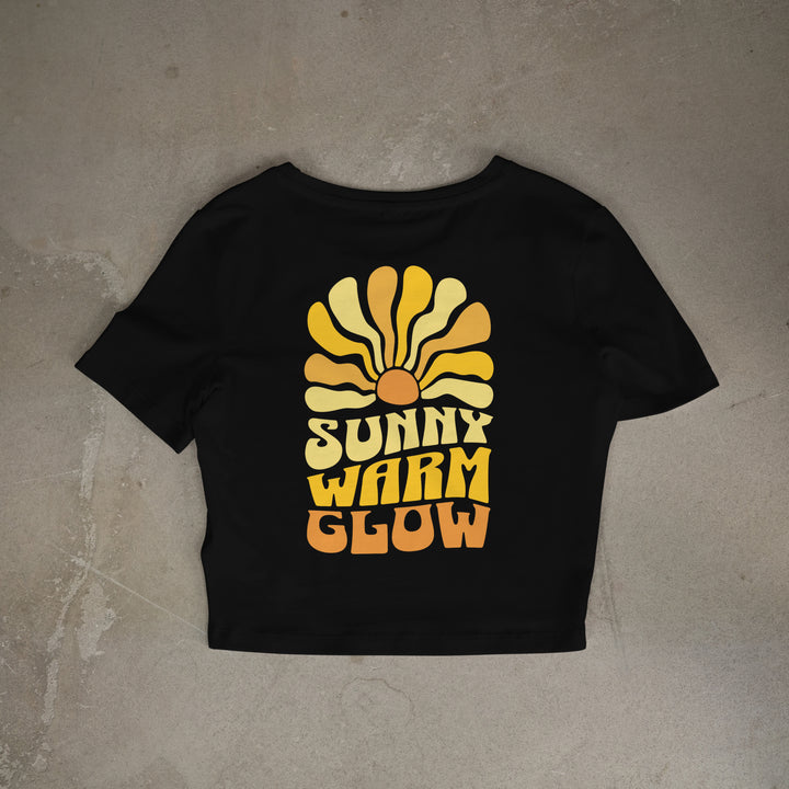 Camiseta 'Sunny Glow' negra con tipografía retro amarilla.