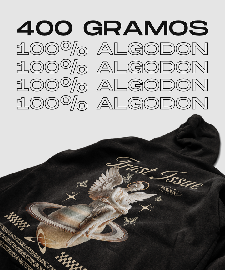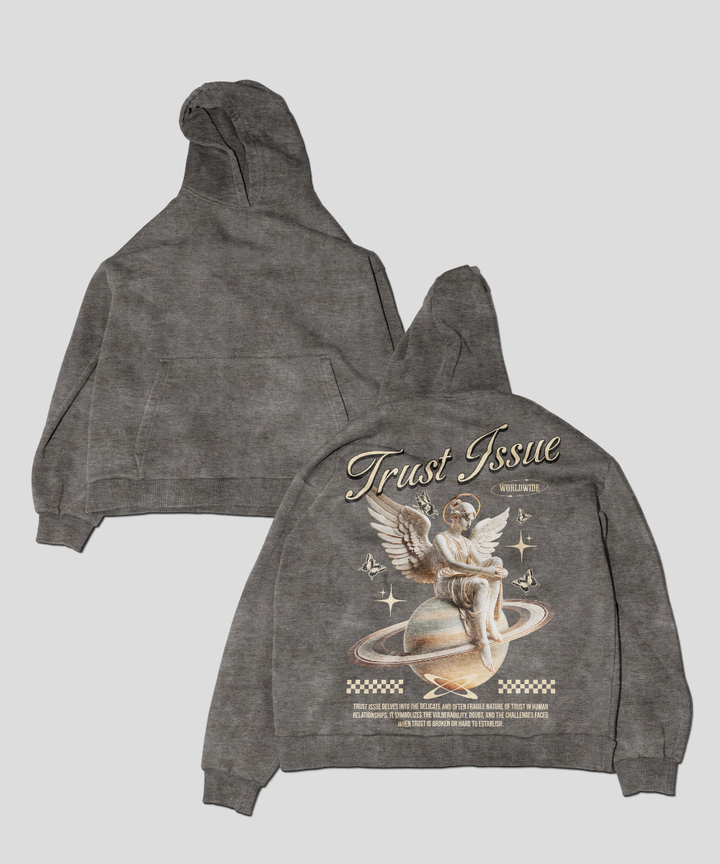 Con un diseño cósmico y un ángel reflexivo, el hoodie 'Trust Issue' expresa fuerza interior y estilo futurista. Piezas limitadas de la colección ANGELS OF DESTINY.