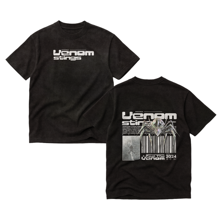 Camiseta básica 100% algodón. Diseño 'Venom Stings' con serpiente e ilustración venenosa.